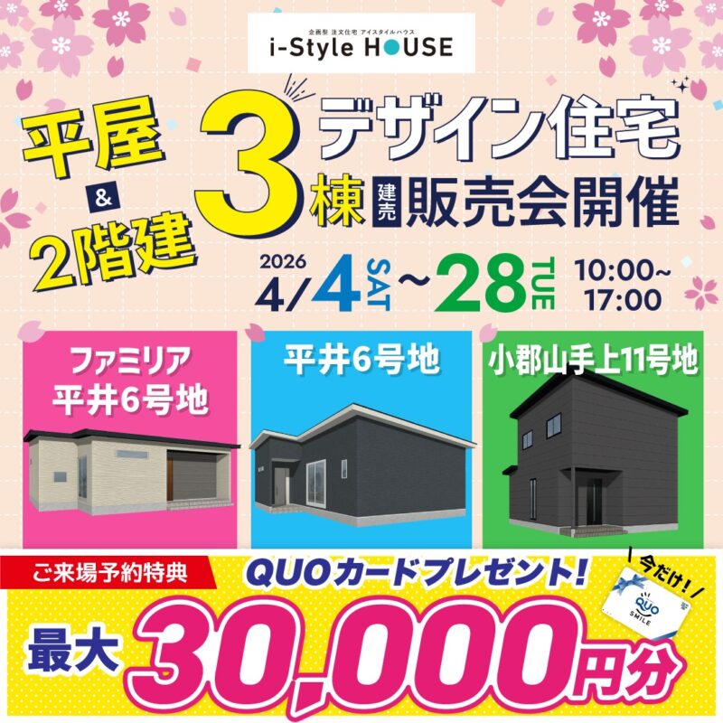 受付中販売会山口店#山口 \平屋&2階建て/3棟同時販売会開催!今だけ最大30,000円分のQ…