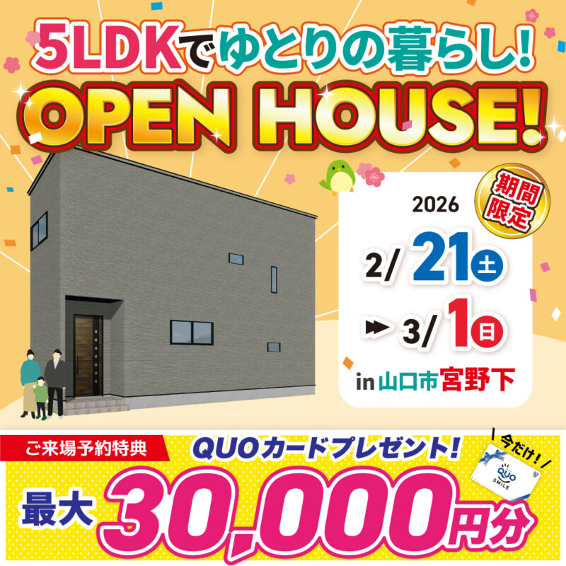 #山口 【7日間限定】宮野のお施主様邸見学会開催!今だけ最大30,000円分のQUOプレゼント♪