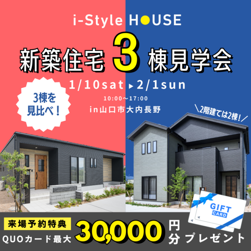 受付中見学会山口店【山口店限定】平屋&2階建て3棟見比べ見学会開催!今だけ最大30,000円分…